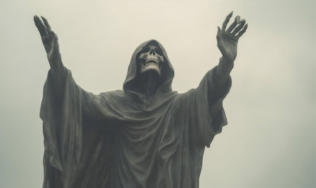 A statue of a grim reaper sitting and skull background.