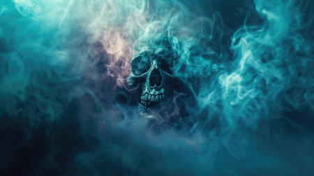Scary skull emerging from a cloud of smoke . Halloween background.