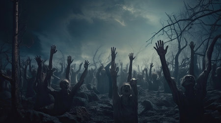 Zombies rises from earth in unsettling cemetery. Lifeless expressions, tattered clothing reveal haunting past. Dim light creates atmosphere of dread. Gravestones, eerie ambiance, decay and horror. AI.