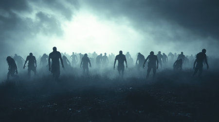 Foggy zombie horde silhouettes approaching against a dark, ominous sky, creating a chilling Halloween atmosphere