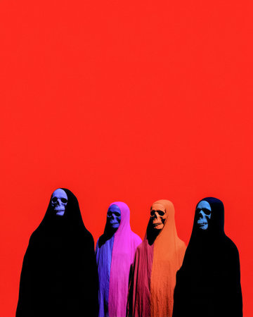 Four figures dressed in vibrant, flowing cloaks with skull masks pose against a striking red backdrop. This surreal scene showcases a unique blend of art and performance, creating an eerie atmosphere.