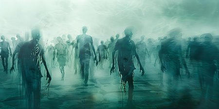 Creepy zombie silhouettes emerging from the misty fog, set against a dark background, ideal for Halloween themes.