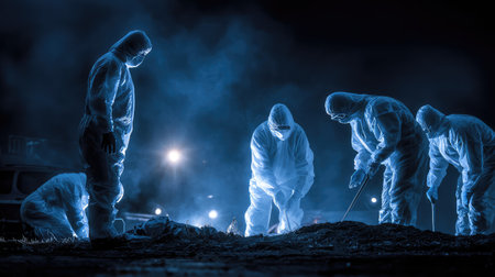 A dedicated forensic team in protective gear investigates a crime scene under mysterious lighting, showcasing the intensity and precision of their work in a dramatic nighttime setting.
