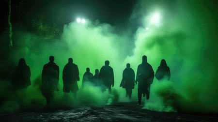 Mysterious hooded figures walking through fog create an eerie and haunting atmosphere. Ai generated image