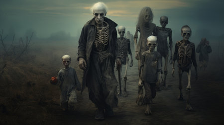 Halloweenthemed image of eerie undead figures moving through apocalyptic setting. Concept Halloween Photoshoot, Eerie Undead Figures, Apocalyptic Setting, Spooky Atmosphere