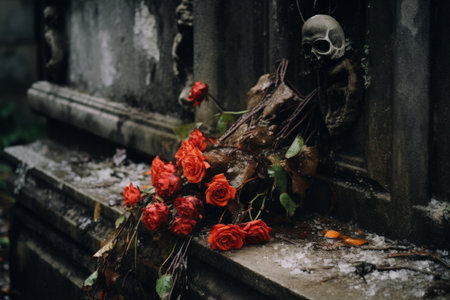 a skull and flowers on a tombstone in a cemetery