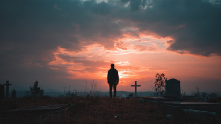 Silhouette of a person in a cemetery at sunset, surrounded by gravestones, contemplating life and considering funeral insurance options.
