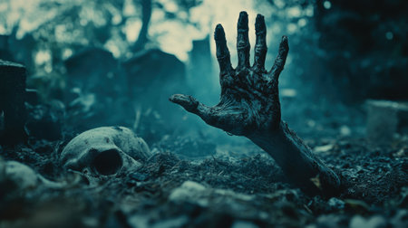 Creepy zombie hand covered in dirt reaches out from a grave in a dark, foggy cemetery, creating a chilling scene.