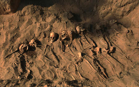 A weathered skull lies on rocky ground, encircled by debris from an ancient burial site