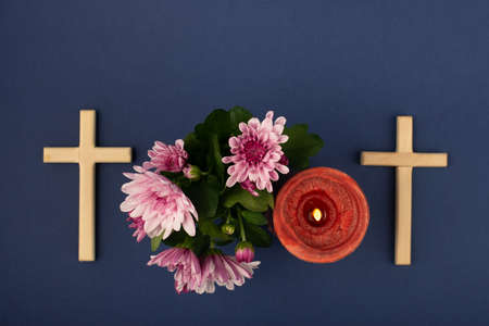 Composition of burning candle, flowers and wooden cross for all souls day. Also suitable for funeral, mourning, grief.