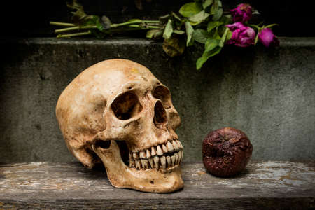 Still life with human skulls and apple rotten on wooden table