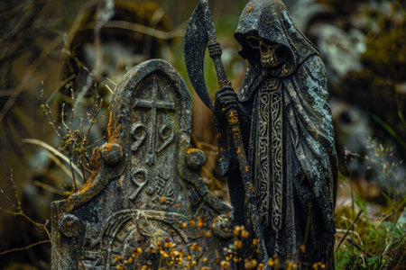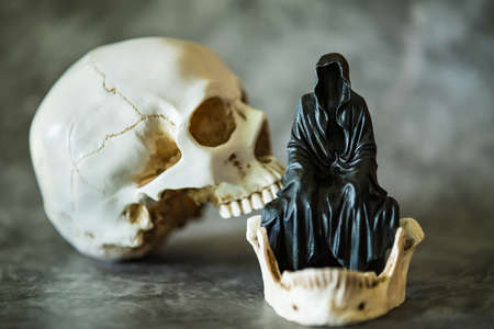 A statue of a grim reaper sitting and skull background.
