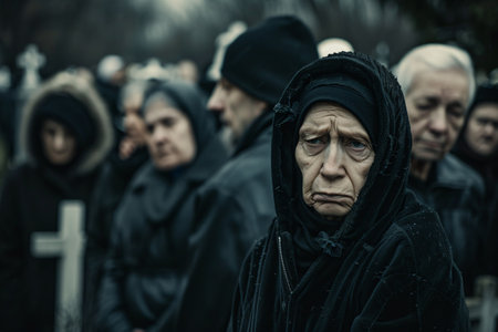 Old woman in black clothes at the cemetery with many people on background