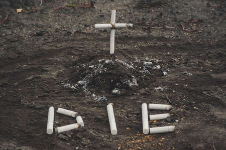 ash and cigarette look like grave and cross, art concept for world no tobacco day. The dangers of nicotine to health. Cigarette kills. black and white grim photo.