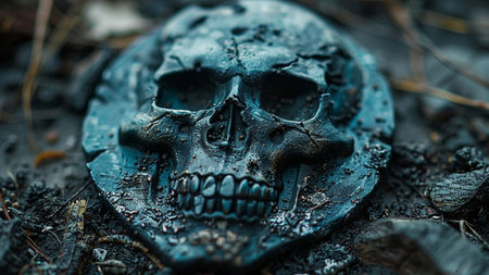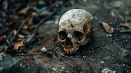 This close-up image shows a weathered skull resting on the forest floor, surrounded by decaying leaves and dark soil. The skull exhibits a textured surface and aged appearance. The lighting creates shadows, enhancing the details of the skull. This composition could be used for various projects needing a depiction of mortality.