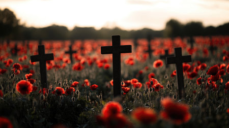 A solemn view of soldiers' graves marked with crosses, standing in a field of poppies, symbolizing Remembrance Day.