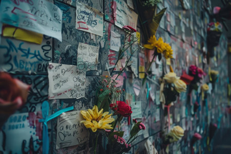A memorial wall adorned with colorful flowers and handwritten notes, A memorial wall covered in hand-written notes and flowers