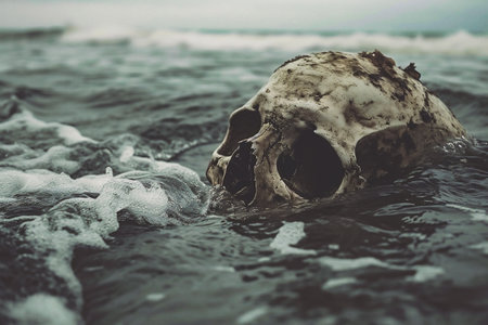 Skull of a human in the water with waves on the background