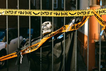 A spooky skeleton is seen behind black bars, surrounded by bright caution tape, creating a festive Halloween atmosphere.
