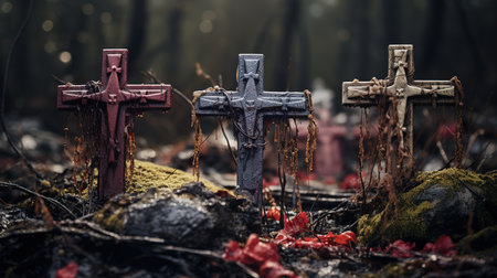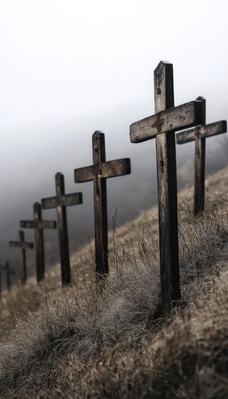 Melancholic Landscape of Wooden Crosses in Foggy Hill Setting