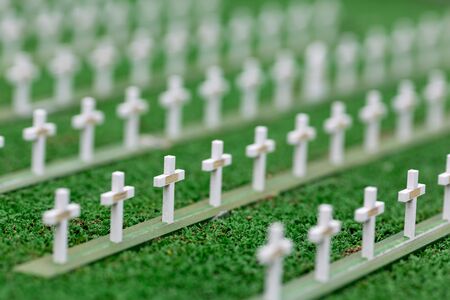Cemetery, grave crosses and green grass, miniature scene outdoor, europe. Mini figures with high detaling of objects, realistically diorama, toy model