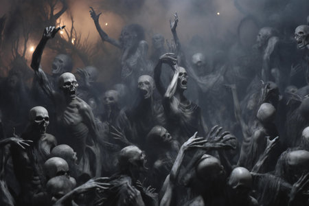 Creepy Halloween scene with zombies in the cemetery. Horror Halloween concept.
