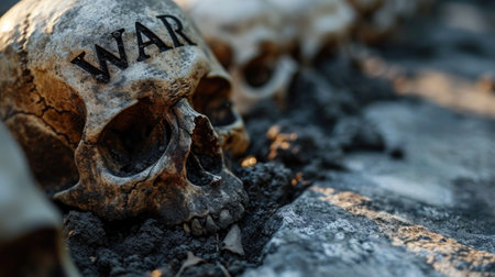 A skull with the word war written on it sits in a pile of dirt, AI