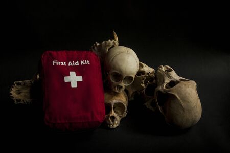 first aid kit with monkey skull on Black background