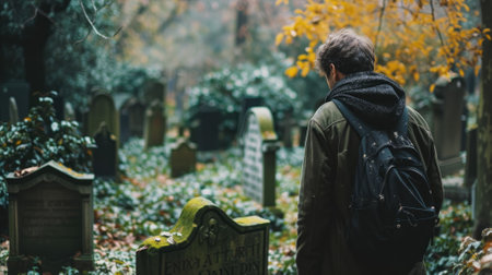 Solitary man with backpack contemplating at a serene, autumn cemetery
