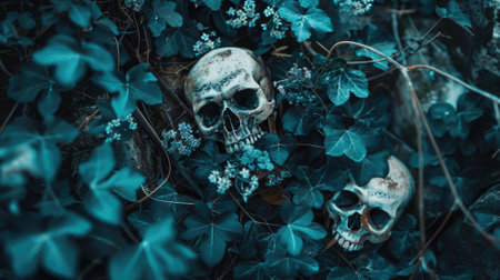 Skulls amidst lush, dark green foliage, creating macabre, natural juxtaposition