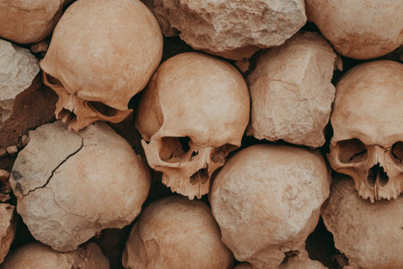 Close up of multiple human skulls stacked against rough stone background, portraying themes of mortality, decay, and the passage of time