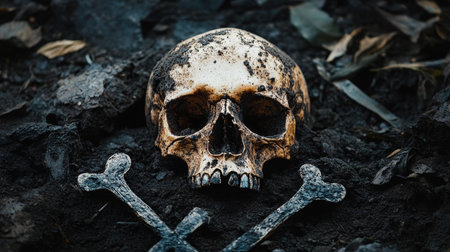 Disturbing Human Skull Surrounded by Dark Soil, Crossed Bones, and Eerie Atmosphere of Death