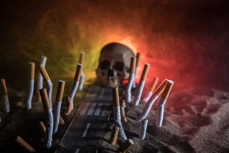 No smoking concept. Creative artwork table decoration with cigarettes. Cigarettes cause cancer and kill. Road to the death. Death row with cigarettes. Selective focus