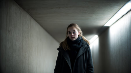 A woman walks through a narrow tunnel in a city. The walls are gray, and the lighting is low. She wears a coat and scarf, looking ahead with a serious expression.