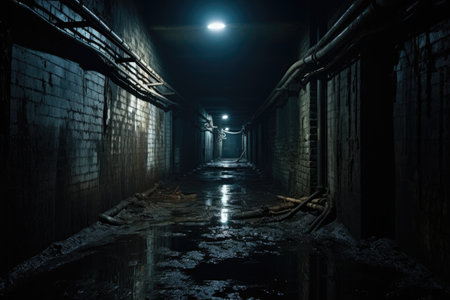 Abandoned industrial tunnel with water reflections, eerie and mysterious concept