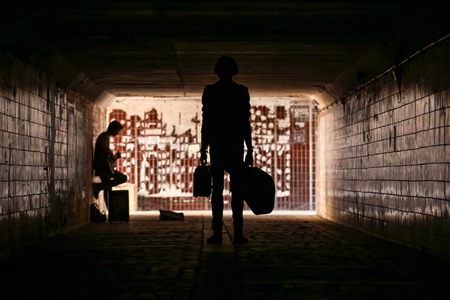 Two street musicians in the underpass. Silhouette photo. Vagrant lifestyle. Playing to make money a living. Unemployed musician. Future rock star. Horizontally framed shot.