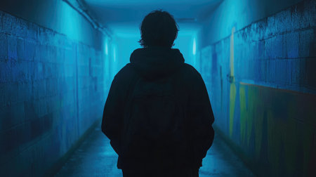 Lone Figure Walking Through Moody Urban Tunnel at Night
