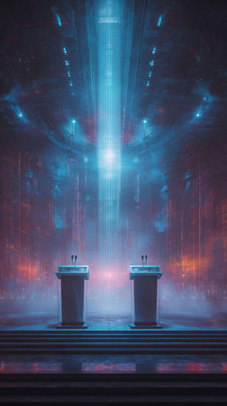 vibrant debate stage featuring three podiums under colorful lights.