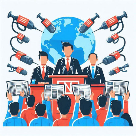 Journalists and journalists with microphones at press conference. Vector illustration.