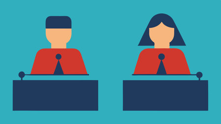 Bold art showcases two figures at podiums engaged in a lively political debate against a backdrop of colorful paper waves.