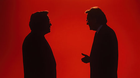 A silhouette of two individuals facing each other in conversation, contrasted against a striking red background.