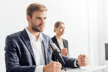 businessman in formal wear talking during conference in conference hall