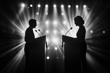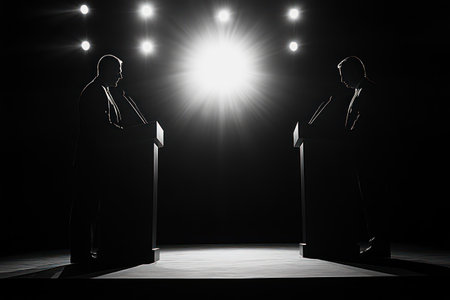 Two silhouetted figures stand at podiums under spotlight, symbolizing political debates, arguments, and leadership opposition.