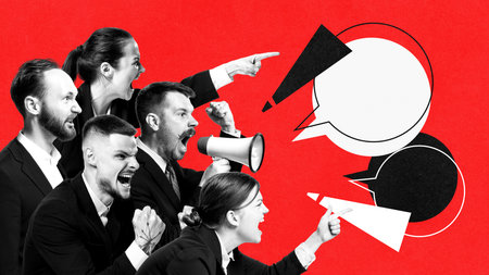 Digital artwork of angry diverse protesters raising fists and shouting with speech bubbles on red background. Concept of civil resistance, protest campaigns, social justice, activism media.