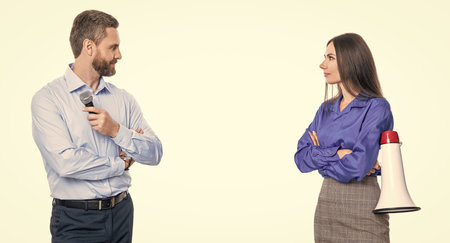 business man promoter has idea. business advertisement. advertisement concept. business idea advertisement. businesspeople with microphone and loudspeaker isolated on white. Promotional campaign
