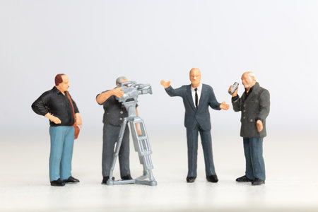 Miniature figure of a male journalist interviewing a businessman, with a cameraman recording. This scene represents the communication process in journalism and business