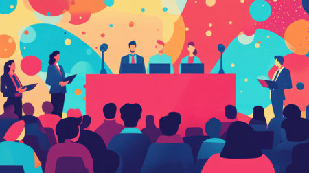 Two figures stand at podiums in a vibrant political debate setting, surrounded by colorful paper waves and bold silhouettes that energize the scene.