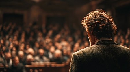 A man in a suit giving a speech to a crowd. Generative AI image.