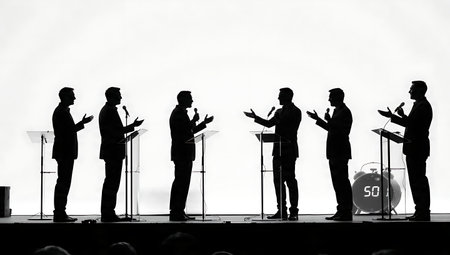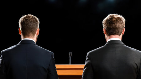 Two silhouetted figures stand at podiums under spotlight, symbolizing political debates, arguments, and leadership opposition.