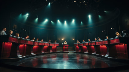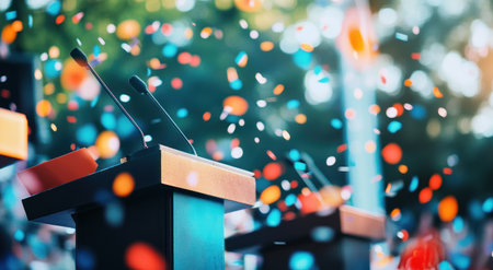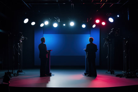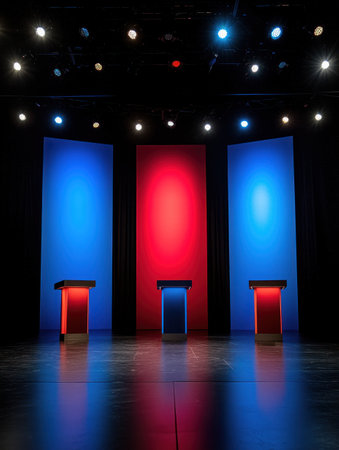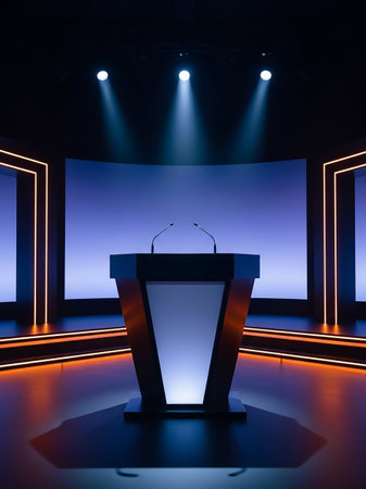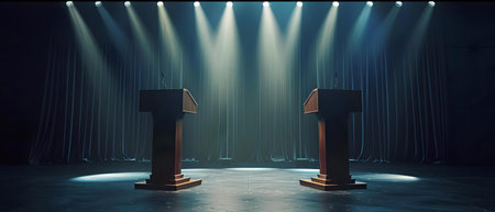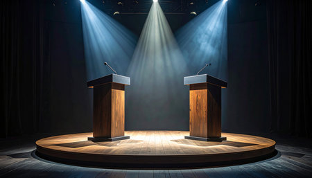 Bright stage lights illuminate two podiums positioned for a formal debate or presentation, creating a sense of anticipation.